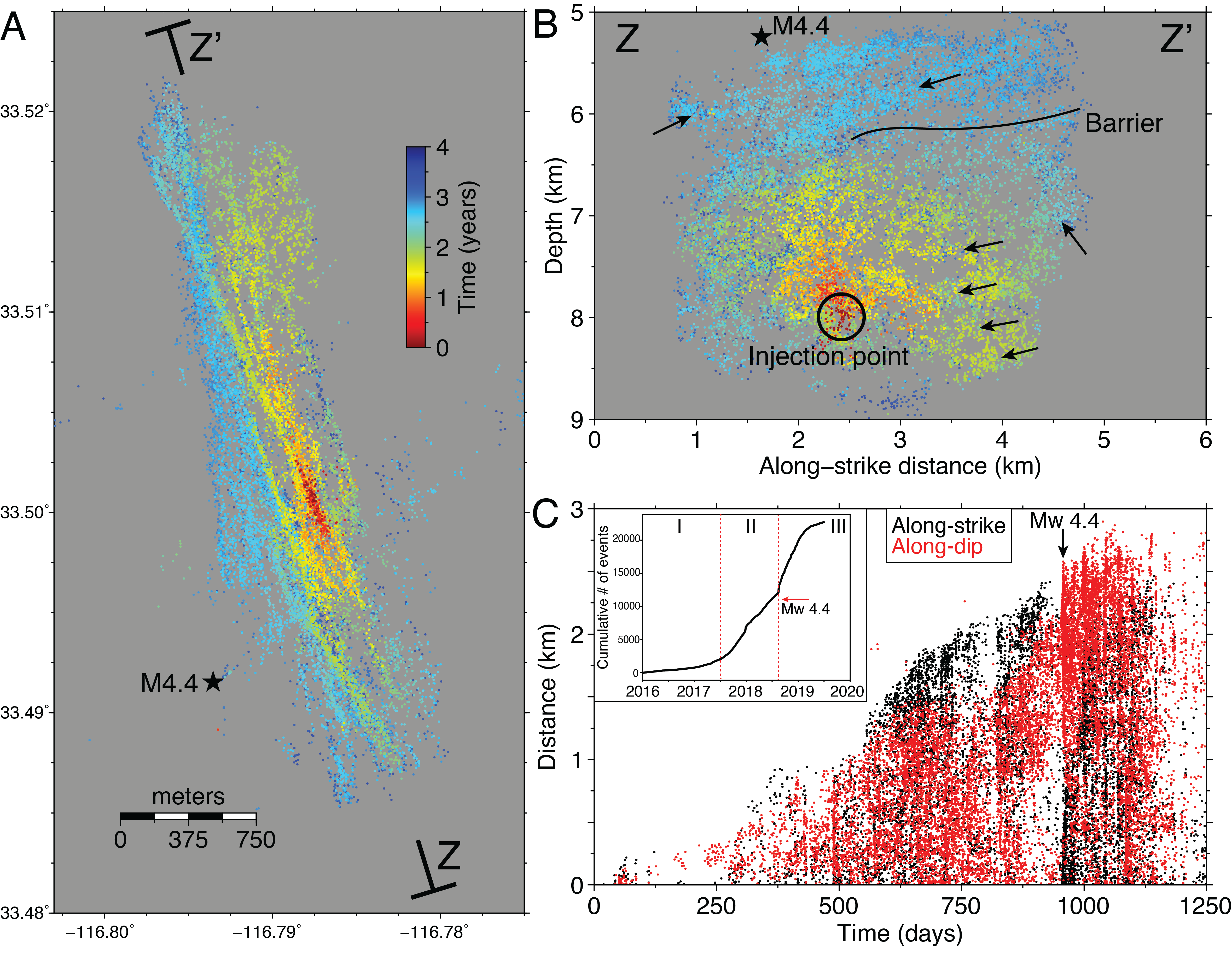 Figure Caption: Summary of space and time behavior of the seismicity during the 2016-2020 Cahuilla swarm in Southern California.